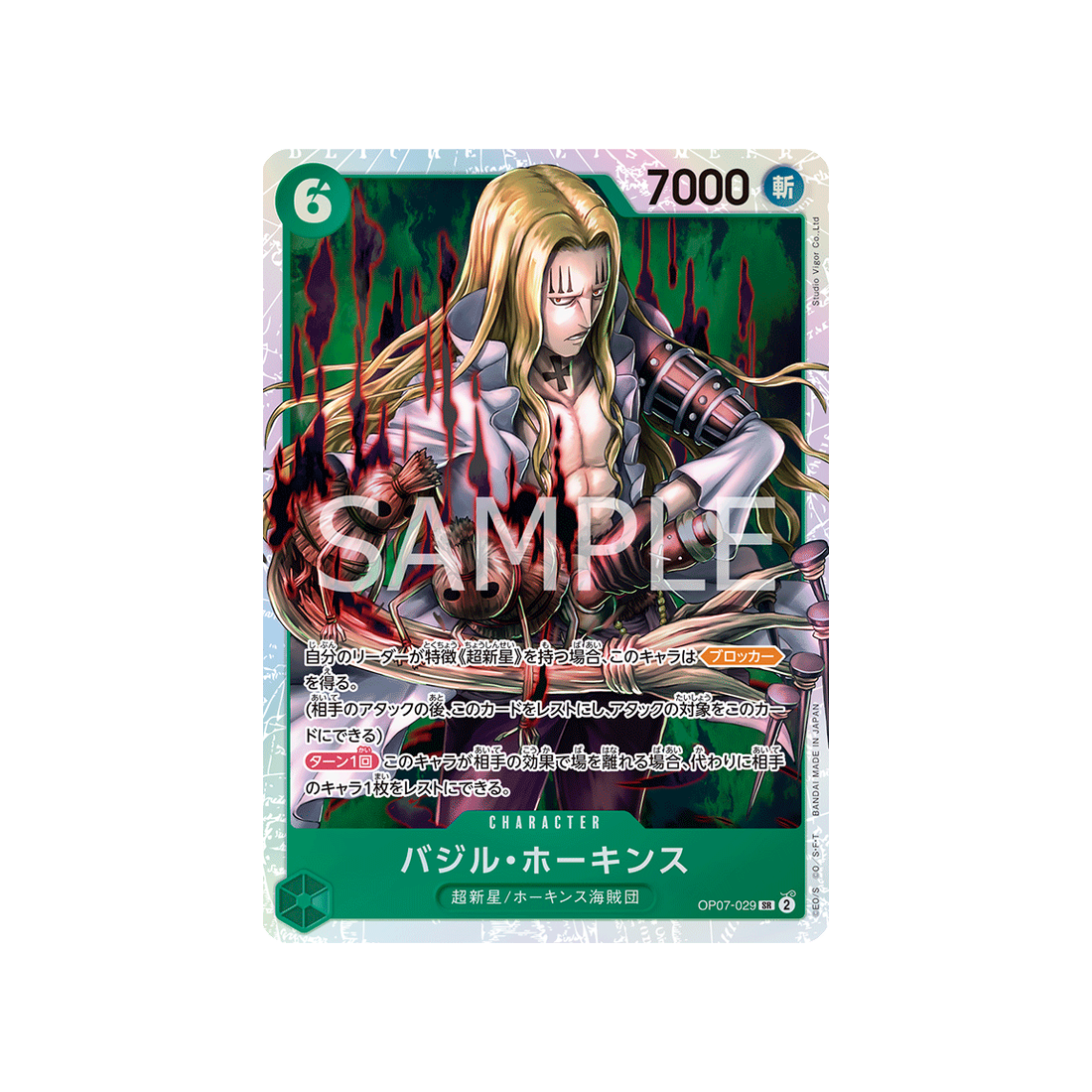Ajoutez la carte Character Basil Hawkins à votre collection One Piece dès maintenant ! Avec sa rareté SR , cette carte de la série OP07 500 Years In The Future est un véritable bijou pour les fans de la famille Supernovae/Equipage de Hawkins.