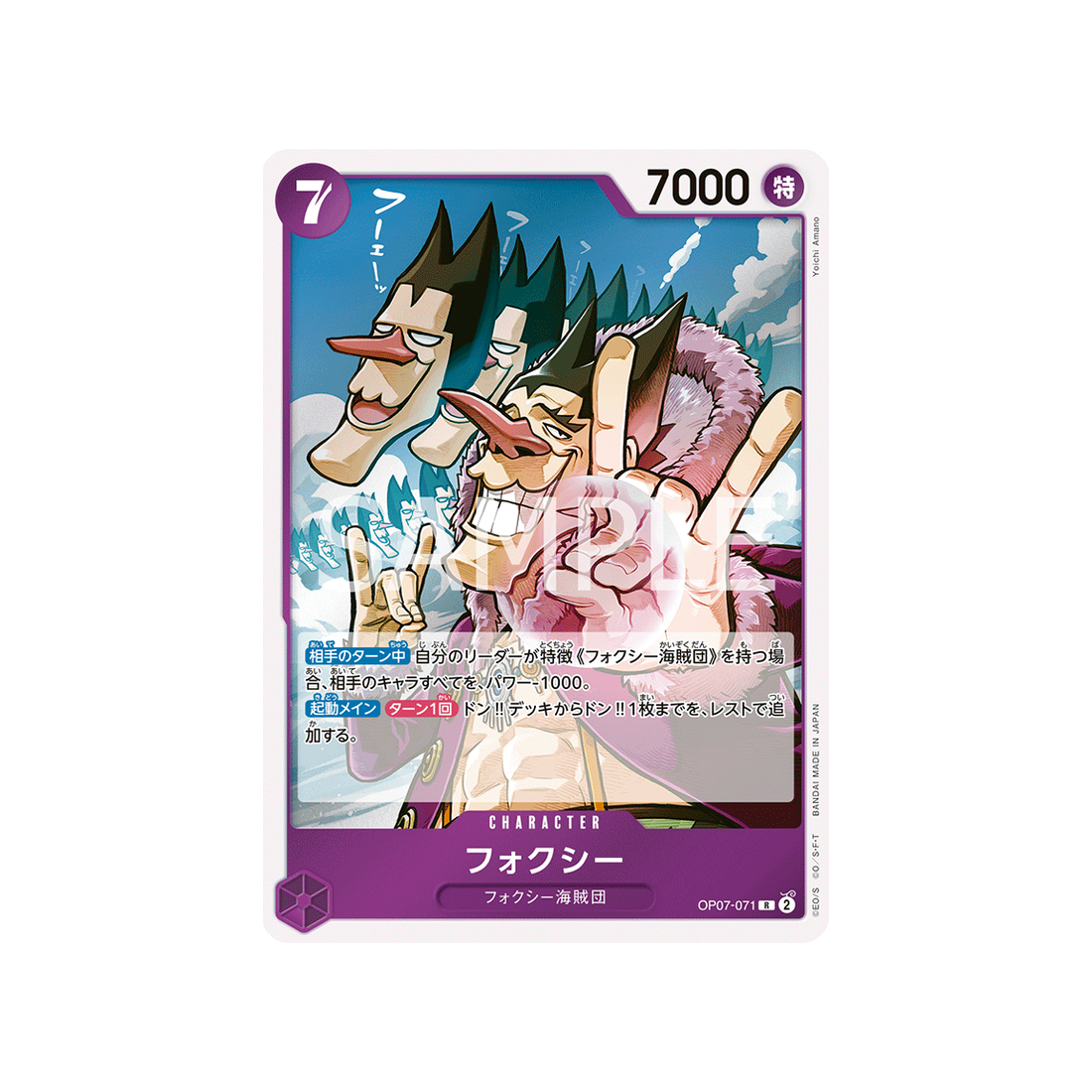 Ajoutez la carte Character Foxy à votre collection One Piece dès maintenant ! Avec sa rareté R , cette carte de la série OP07 500 Years In The Future est un véritable bijou pour les fans de la famille Equipage de Foxy.