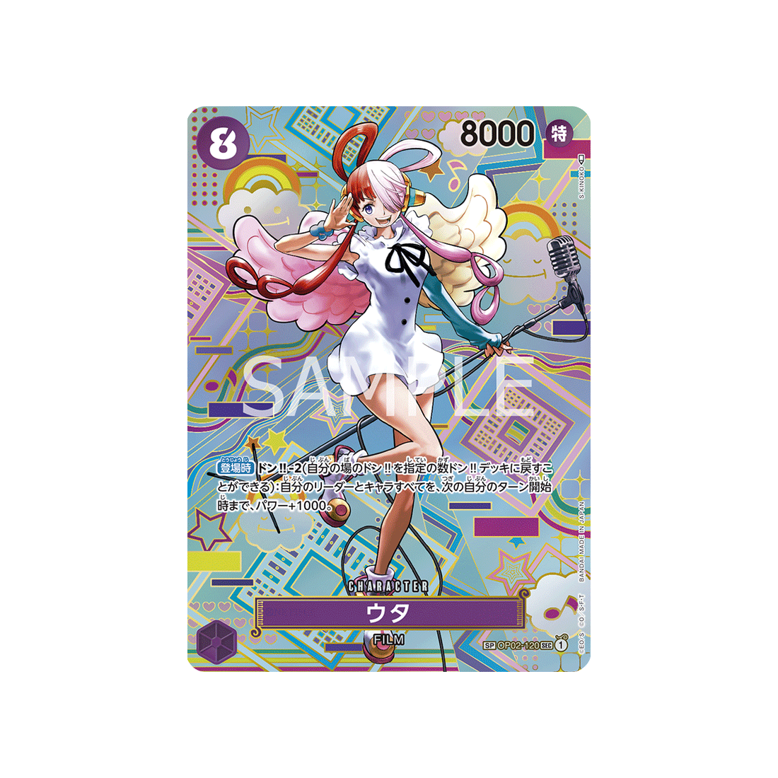 Si tu cherches une carte qui peut s'adapter à toutes les situations, ne cherchez pas plus loin que la carte OP02-120! Avec un coût de 8 'Don!', une puissance Spécial de 8000 points et de couleur Violet, la carte Character Uta est un choix fiable pour les joueurs de tous niveaux.