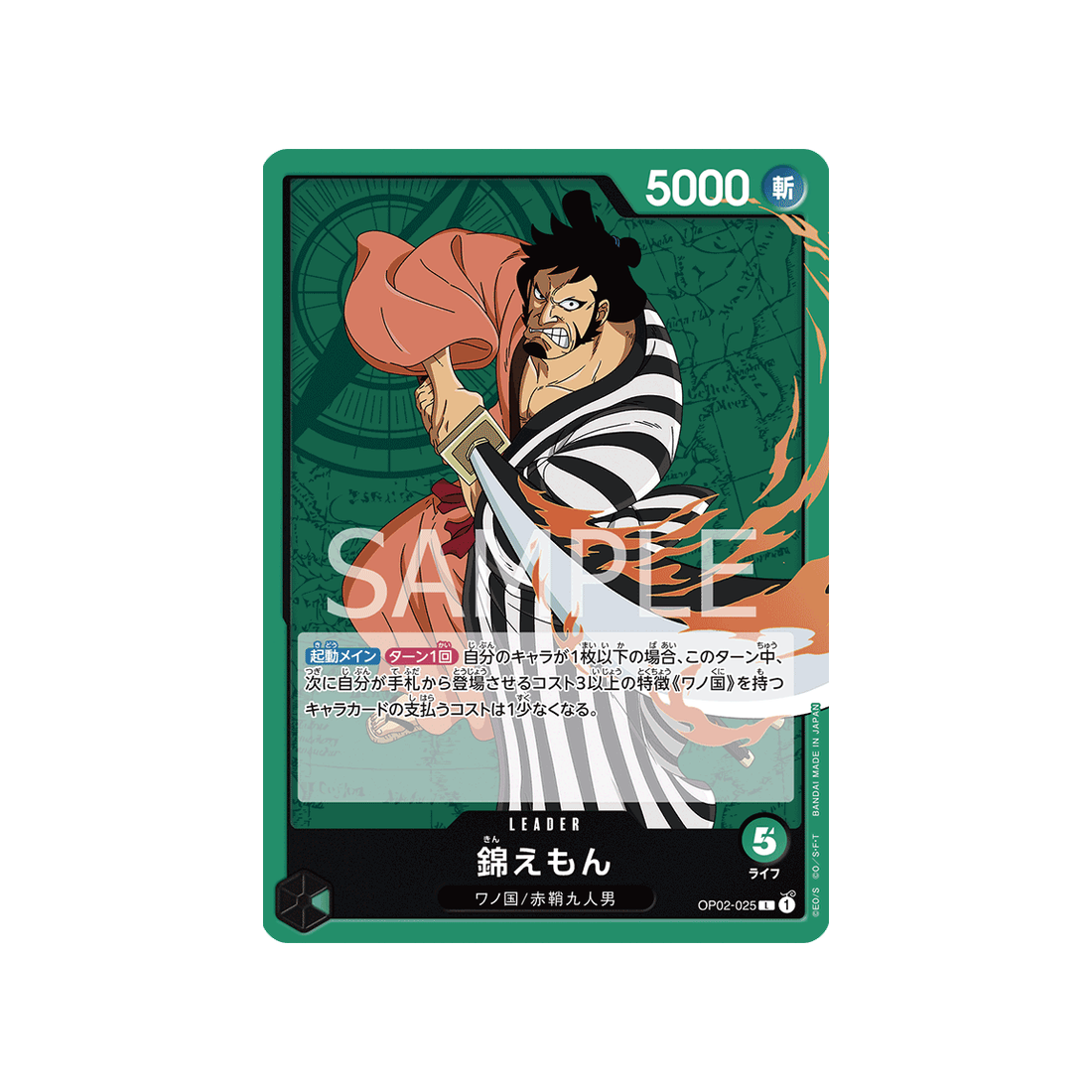 Ajoutez la carte Leader Kin'emon à votre collection One Piece dès maintenant ! Avec sa rareté L , cette carte de la série OP02 Paramount War est un véritable bijou pour les fans de la famille Pays de Wano/Les Neufs Akazayas.