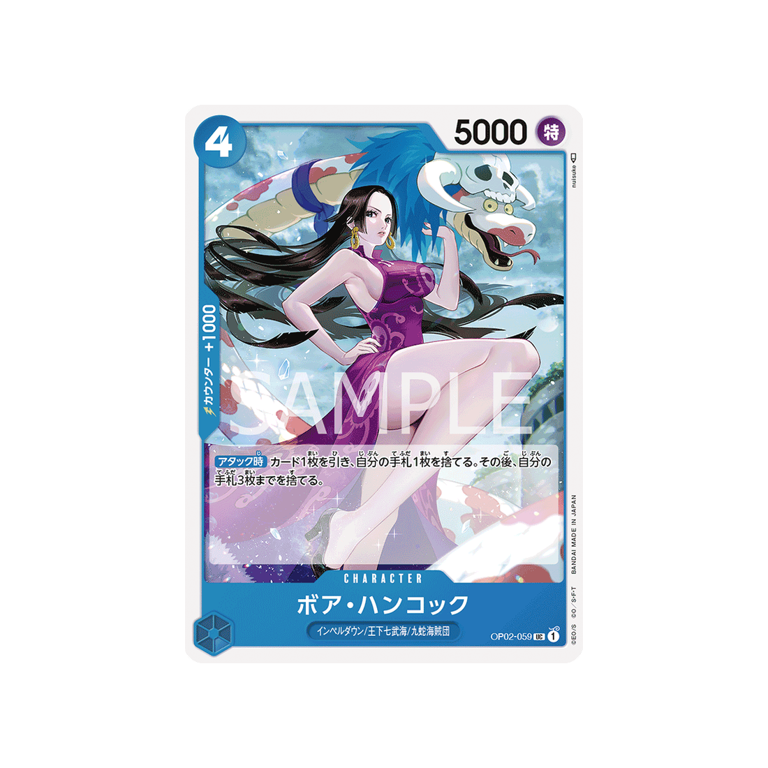 Si tu cherches une carte qui peut s'adapter à toutes les situations, ne cherchez pas plus loin que la carte OP02-059! Avec un coût de 4 'Don!', une puissance Spécial de 5000 points, ainsi qu'une valeur de contre de 1000 et de couleur Bleu, la carte Character Boa Hancock est un choix fiable pour les joueurs de tous niveaux.
