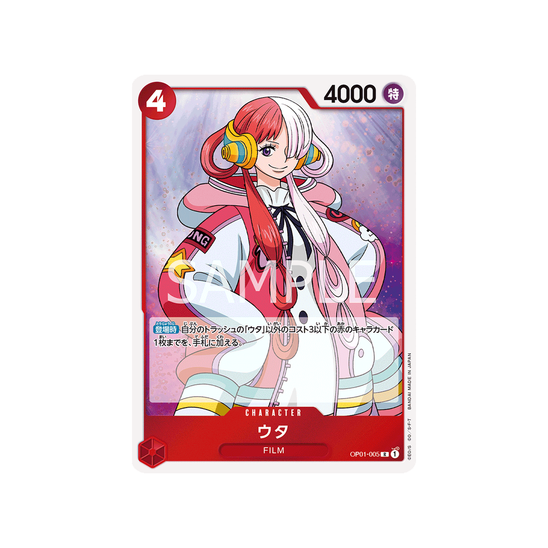 Préparez-vous à affronter tous les défis avec la magnifique carte Character Uta numéro 005 de la série Romance Dawn, une carte Rare et puissante qui fera la fierté de votre collection.