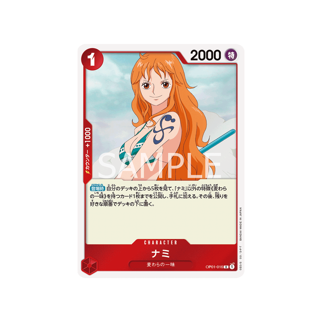 Le Character est une carte indispensable dans tout deck qui se respecte ! Et Nami sera ton allié le plus précieux : de couleur Rouge et avec l'attribut Spécial, il fera des ravages via un coût de 1 'Don!' et sa puissance de 2000 points, ainsi qu'une valeur de contre de 1000!