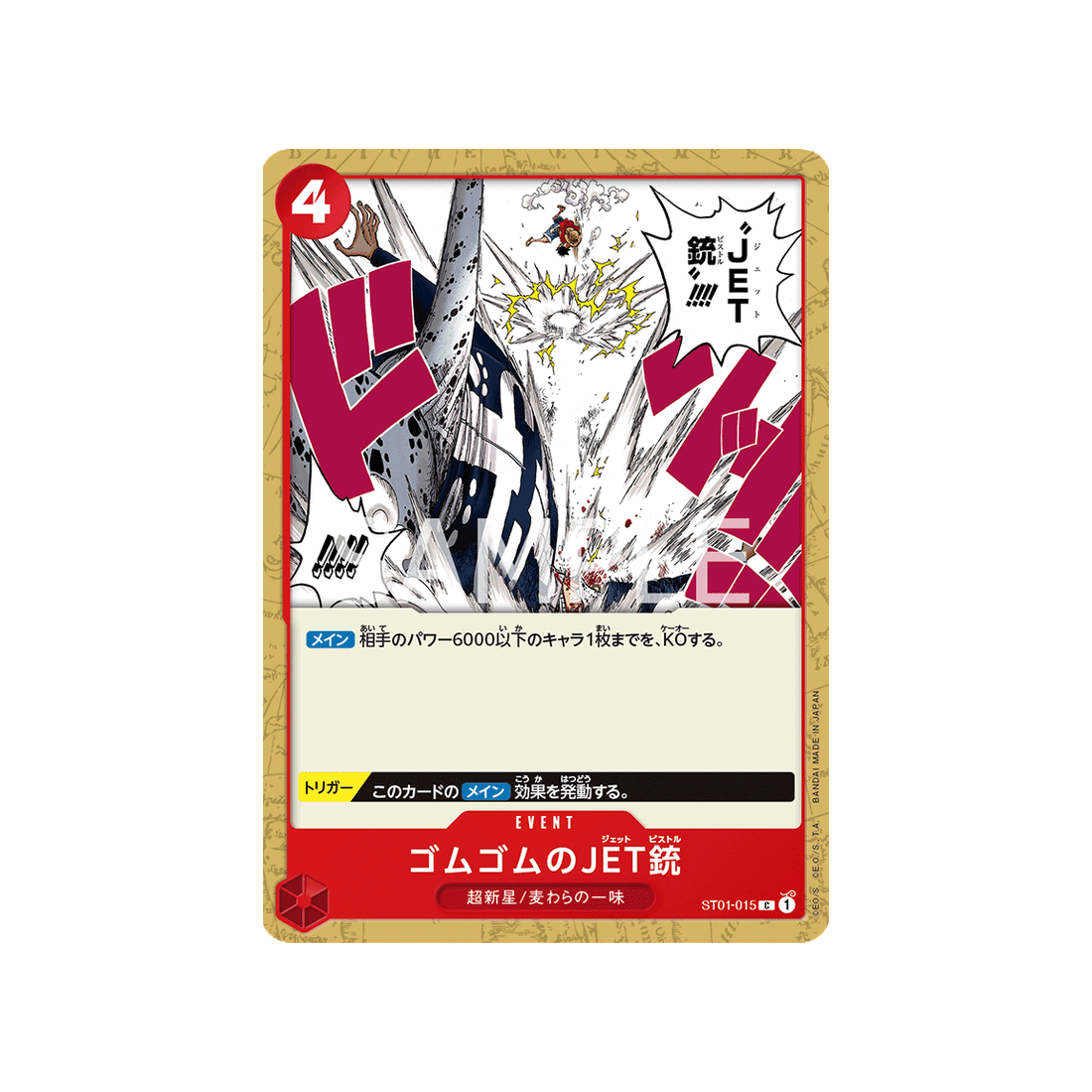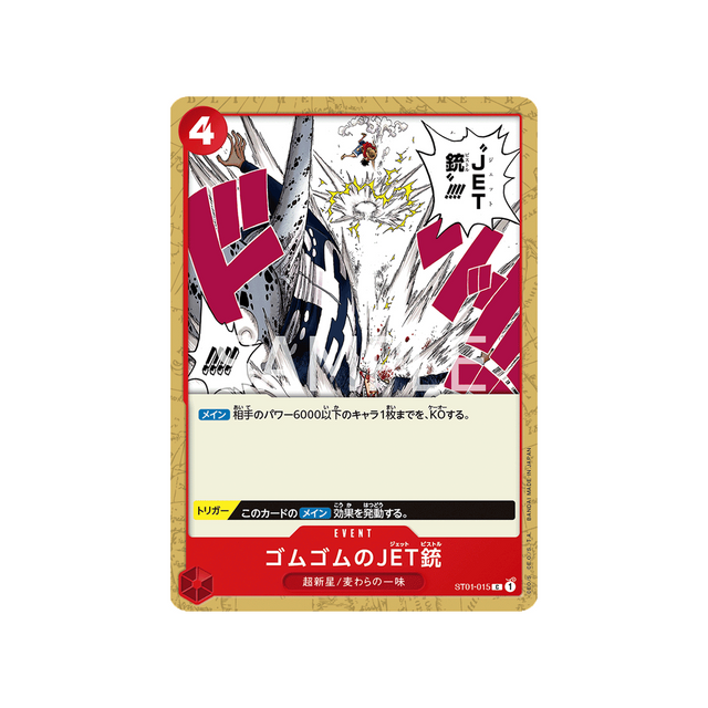 Ajoutez la carte Event Gomu Gomu no Jet Gun à votre collection One Piece dès maintenant ! Avec sa rareté C , cette carte de la série ST01 Equipage Du Chapeau De Paille est un véritable bijou pour les fans de la famille Supernovae/Equipage du Chapeau de Paille.