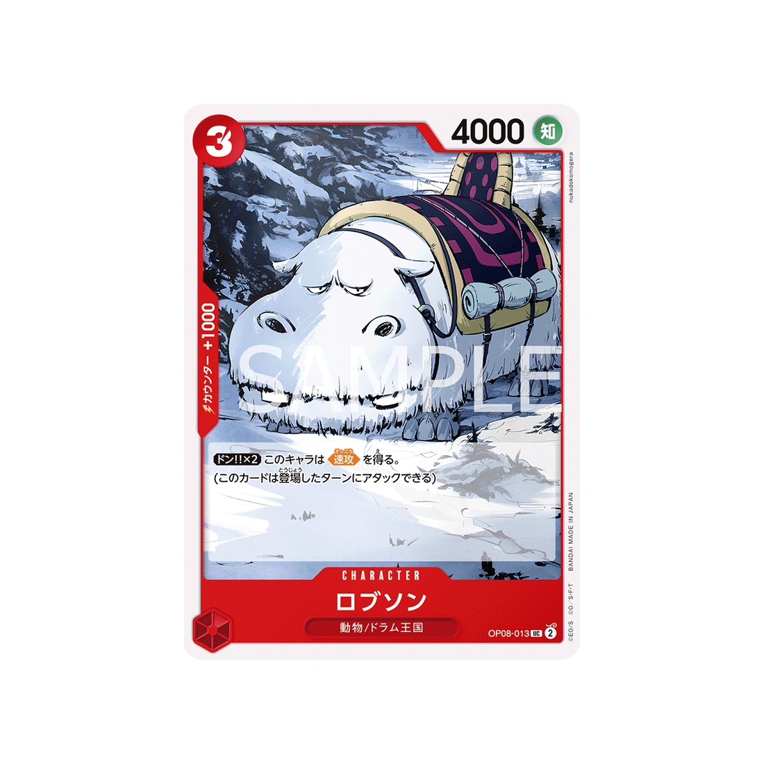 Ajoutez la carte Character Robson à votre collection One Piece dès maintenant ! Avec sa rareté UC , cette carte de la série OP08 Two Legends est un véritable bijou pour les fans de la famille Animal/Ile de Drum.