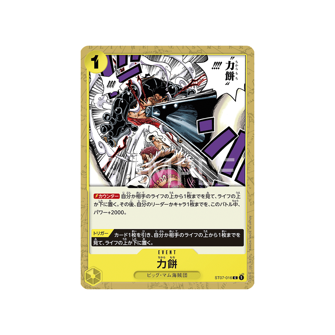 Préparez-vous à affronter tous les défis avec la magnifique carte Event Chikara Mochi numéro 016 de la série Equipage De Big Mom, une carte Commune et puissante qui fera la fierté de votre collection.