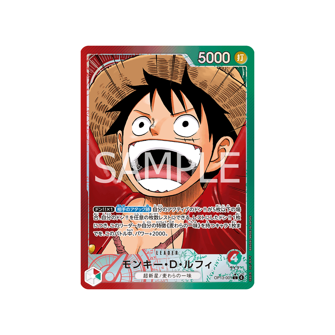 Que tu sois novice ou joueur expérimenté, la carte OPC-OP13-001-P2 est un choix fiable. Avec un coût de 4, ainsi qu'une valeur de contre de - et une attaque de type Frappe d'une puissance de 5000 points, elle peut s'adapter à toutes les situations. Un incontournable pour tout duelliste One Piece TCG !