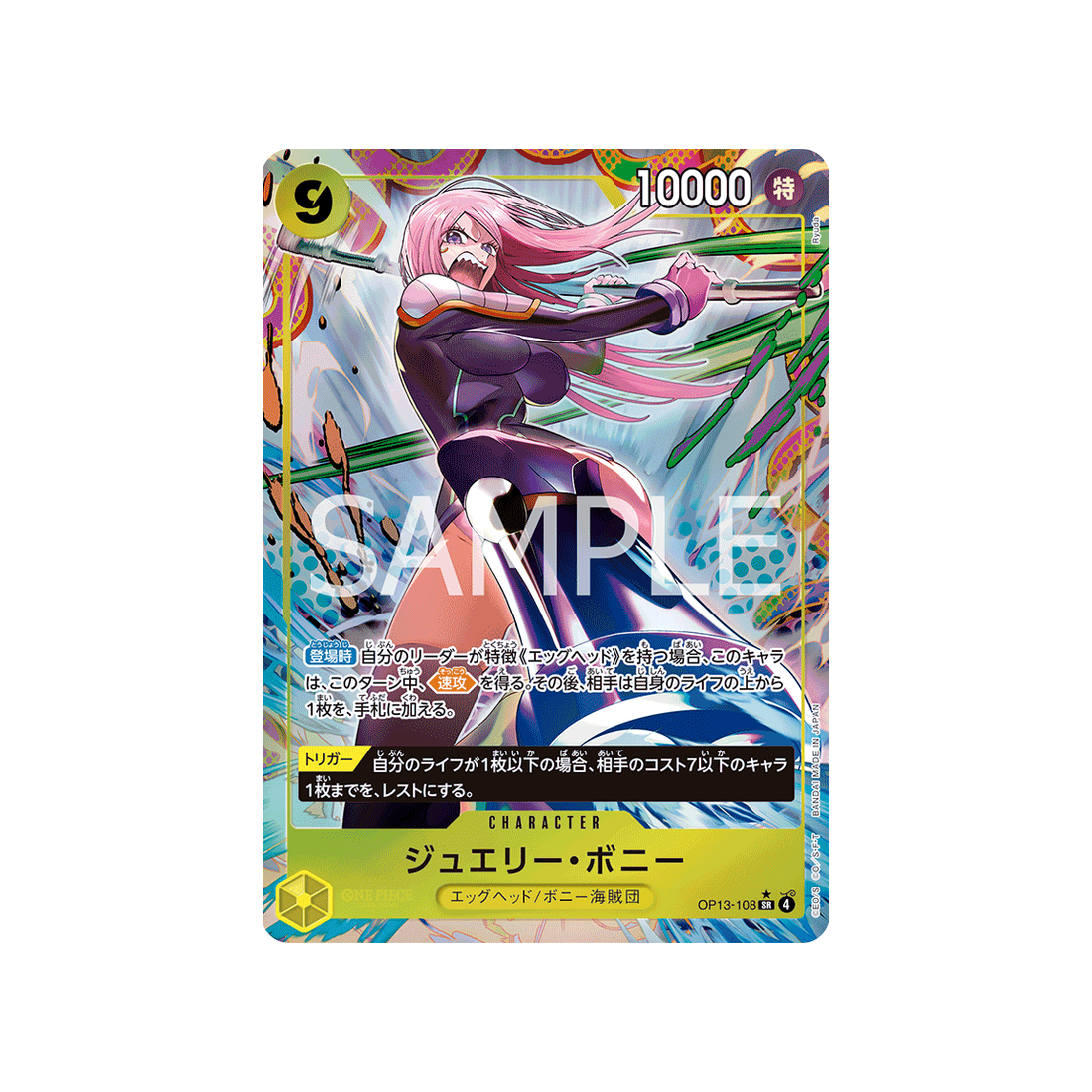 Deviens le maître des mers avec la carte Super Rare numéro OP13-108 : Jewelry Bonney, une carte de collection dans sa version Parallèle 1indispensable pour tout fan de One Piece.