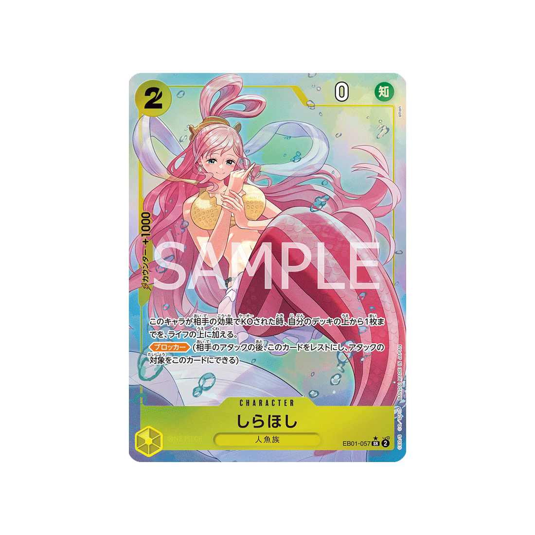 Si tu cherches une carte qui peut s'adapter à toutes les situations, ne cherchez pas plus loin que la carte EB01-057! Avec un coût de 2 'Don!', une puissance Sagesse de -0 points, ainsi qu'une valeur de contre de 1000 et de couleur Jaune, la carte Character Shirahoshi est un choix fiable pour les joueurs de tous niveaux.