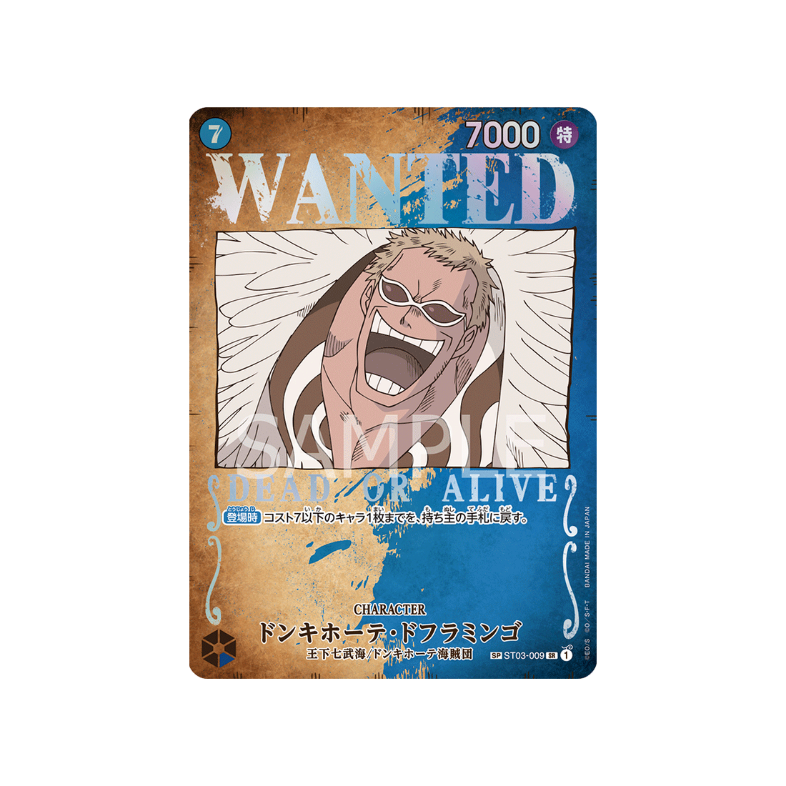 Si tu cherches une carte qui peut s'adapter à toutes les situations, ne cherchez pas plus loin que la carte ST03-009! Avec un coût de 7 'Don!', une puissance Spécial de 7000 points et de couleur Bleu, la carte Character Donquixote Doflamingo est un choix fiable pour les joueurs de tous niveaux.