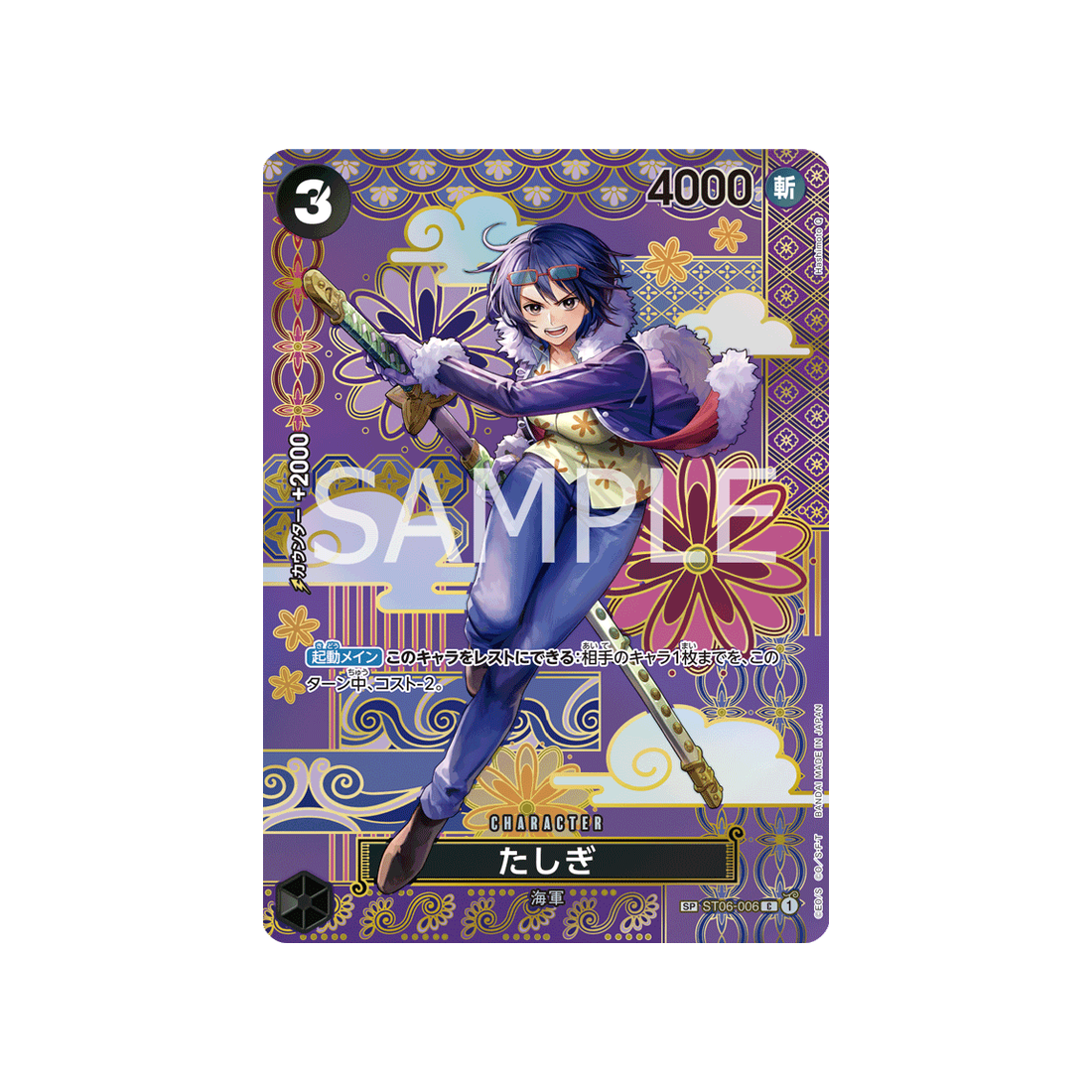Le type Character est une carte indispensable dans tout deck qui se respecte ! Et Tashigi sera ton allié le plus précieux : de couleur Noir et avec l'attribut Coupe, il fera des ravages via un coût de 3 'Don!' et sa puissance de 4000 points, ainsi qu'une valeur de contre de 2000!