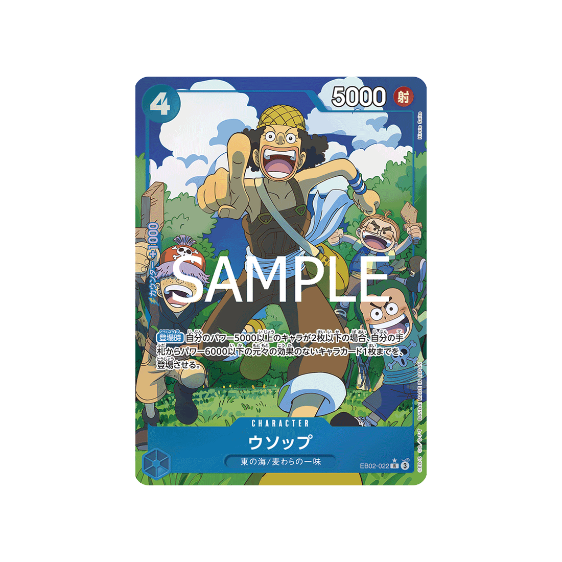 Si tu cherches une carte qui peut s'adapter à toutes les situations, ne cherches pas plus loin que la carte OPC-EB02-022-P1! Avec un coût de 4 'Don!', une puissance Distance de 5000 points, ainsi qu'une valeur de contre de 1000 et de couleur Bleu, la carte Character Usopp est un choix fiable pour les joueurs de tous niveaux.