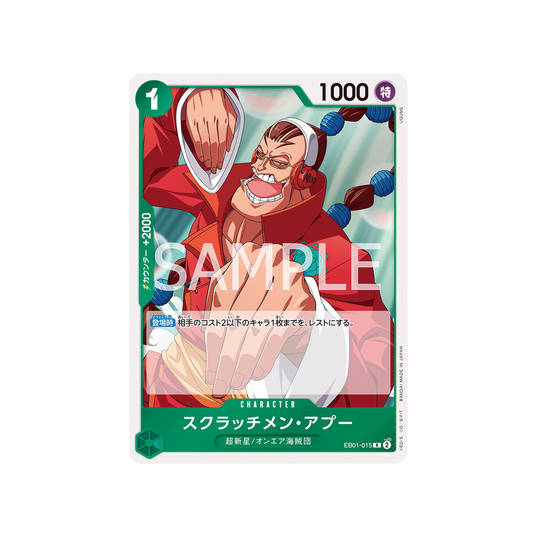 Si tu cherches une carte qui peut s'adapter à toutes les situations, ne cherchez pas plus loin que la carte EB01-015! Avec un coût de 1 'Don!', une puissance Spécial de 1000 points, ainsi qu'une valeur de contre de 2000 et de couleur Vert, la carte Character Scratchmen Apoo est un choix fiable pour les joueurs de tous niveaux.
