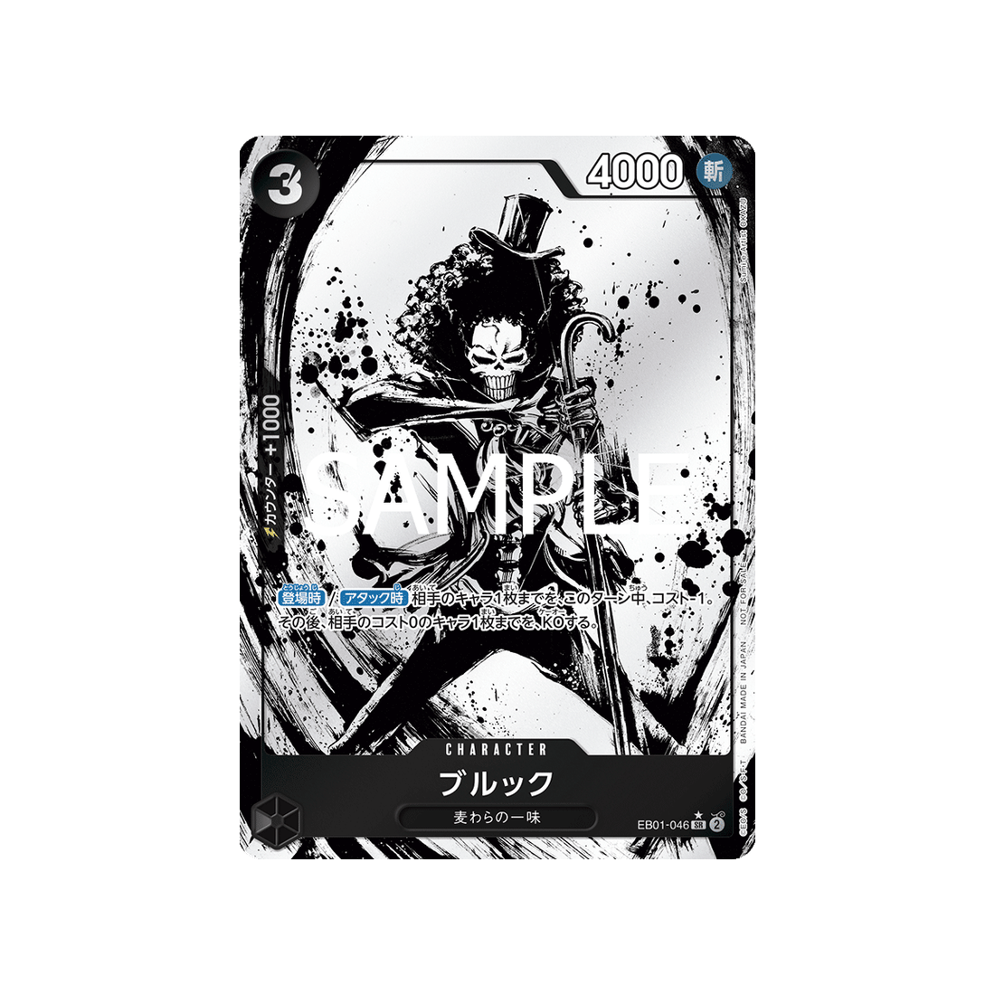 Avec un coût de 3 'Don!', une puissance de 4000 points, ainsi qu'une valeur de contre de 1000 et une attaque de type Coupe, la carte Character Brook est un must-have pour tout fan de One Piece qui se respecte.