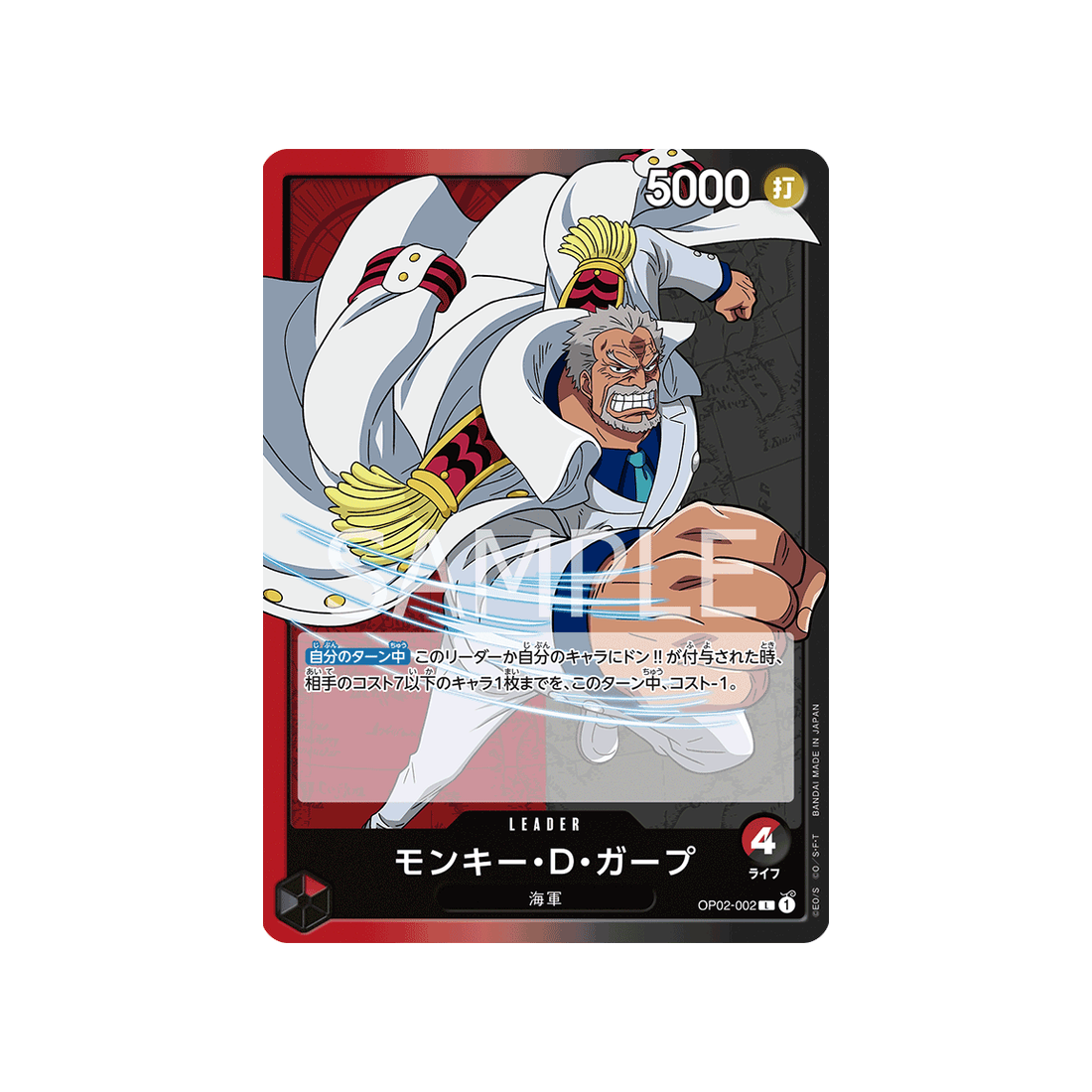 Avec ses 4 points de vie, une puissance de 5000 points et une attaque de type Frappe, la carte Leader Monkey D. Garp est un must-have pour tout fan de One Piece qui se respecte.