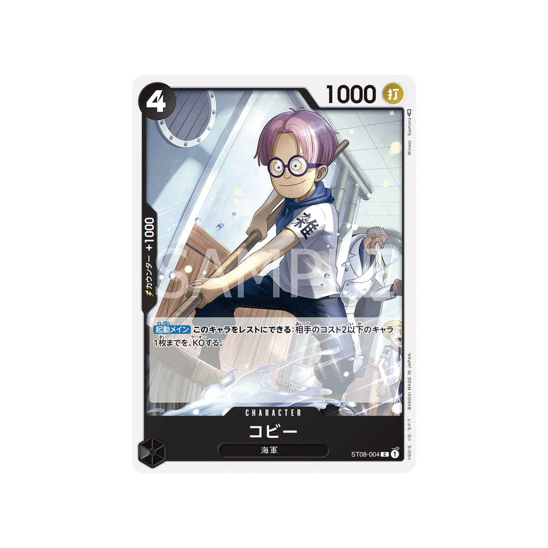 Le Character est une carte indispensable dans tout deck qui se respecte ! Et Coby sera ton allié le plus précieux : de couleur Noir et avec l'attribut Frappe, il fera des ravages via un coût de 4 'Don!' et sa puissance de 1000 points, ainsi qu'une valeur de contre de 1000!