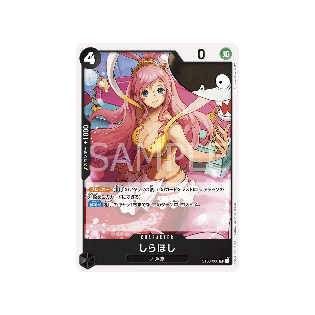 Le Character est une carte indispensable dans tout deck qui se respecte ! Et Shirahoshi sera ton allié le plus précieux : de couleur Noir et avec l'attribut Sagesse, il fera des ravages via un coût de 4 'Don!' et sa puissance de -0 points, ainsi qu'une valeur de contre de 1000!