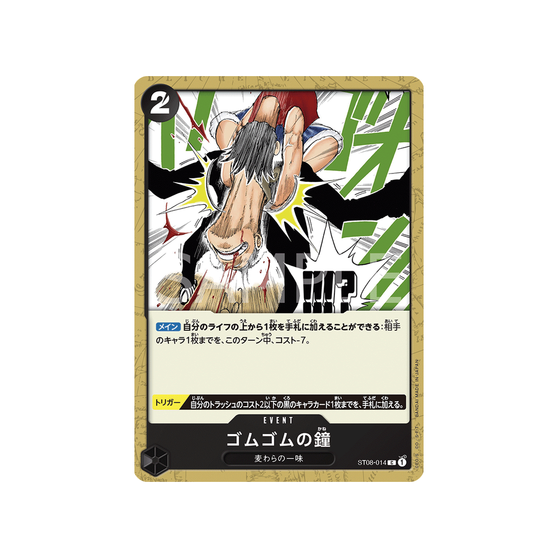 Les cartes Event sont un indispensable dans tout Deck ou collection! Et avec un coût de 2 'Don!', Gum Gum Bell sera ton allié le plus précieux pour retourner le cours de la partie avec son effet décrit plus loin dans la description.