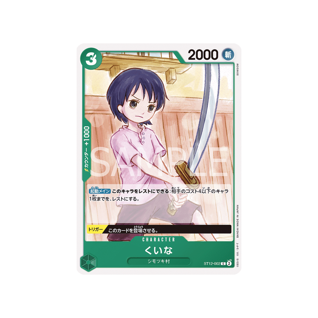 Si tu cherches une carte qui peut s'adapter à toutes les situations, ne cherchez pas plus loin que la carte ST12-002! Avec un coût de 3 'Don!', une puissance Coupe de 2000 points, ainsi qu'une valeur de contre de 1000 et de couleur Vert, la carte Character Kuina est un choix fiable pour les joueurs de tous niveaux.