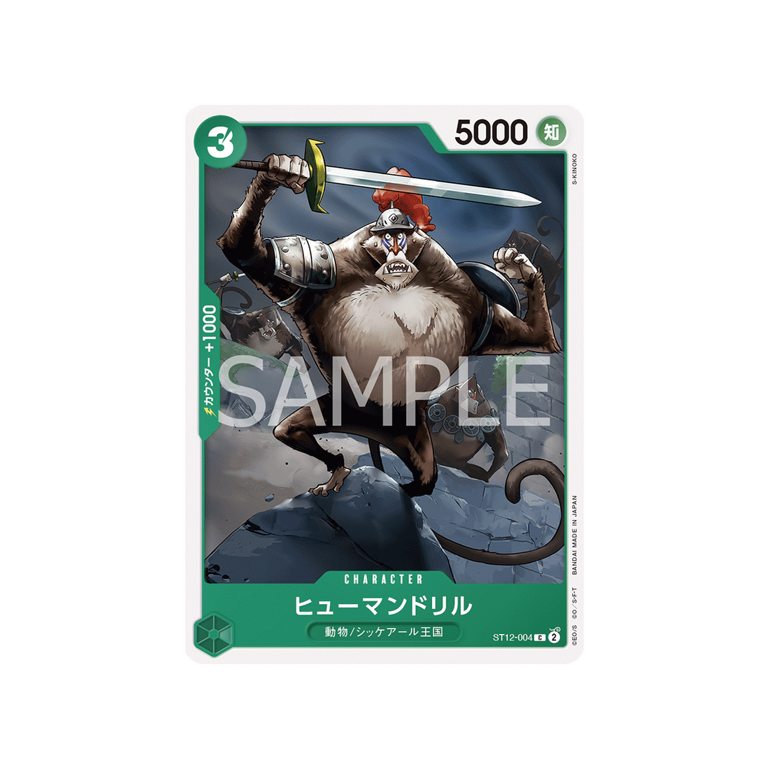Ajoutez la carte Character Humandrill à votre collection One Piece dès maintenant ! Avec sa rareté C , cette carte de la série ST12 Zoro & Sanji est un véritable bijou pour les fans de la famille Animal/Muggy Kingdom.