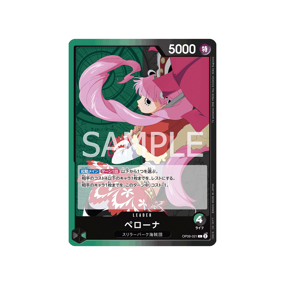 Le type Leader est une carte indispensable dans tout deck qui se respecte ! Et Perona sera ton allié le plus précieux : de couleur Vert/Noir et avec l'attribut Spécial, il fera des ravages via ses 4 points de vie et sa puissance de 5000 points!