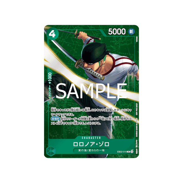 Les cartes de la famille Mers de l'Est/Equipage du Chapeau de Paille sont toujours très prisées par les collectionneurs, et la carte Rare Roronoa Zoro Numéro EB02-019 de la série ne fait pas exception.