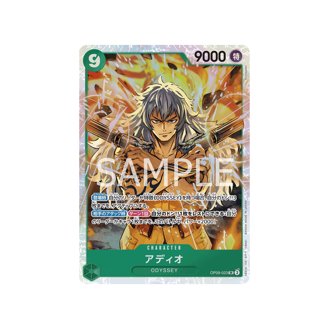 Si tu cherches une carte qui peut s'adapter à toutes les situations, ne cherchez pas plus loin que la carte OP09-023! Avec un coût de 9 'Don!', une puissance Spécial de 9000 points, ainsi qu'une valeur de contre de - et de couleur Vert, la carte Character Adio est un choix fiable pour les joueurs de tous niveaux.