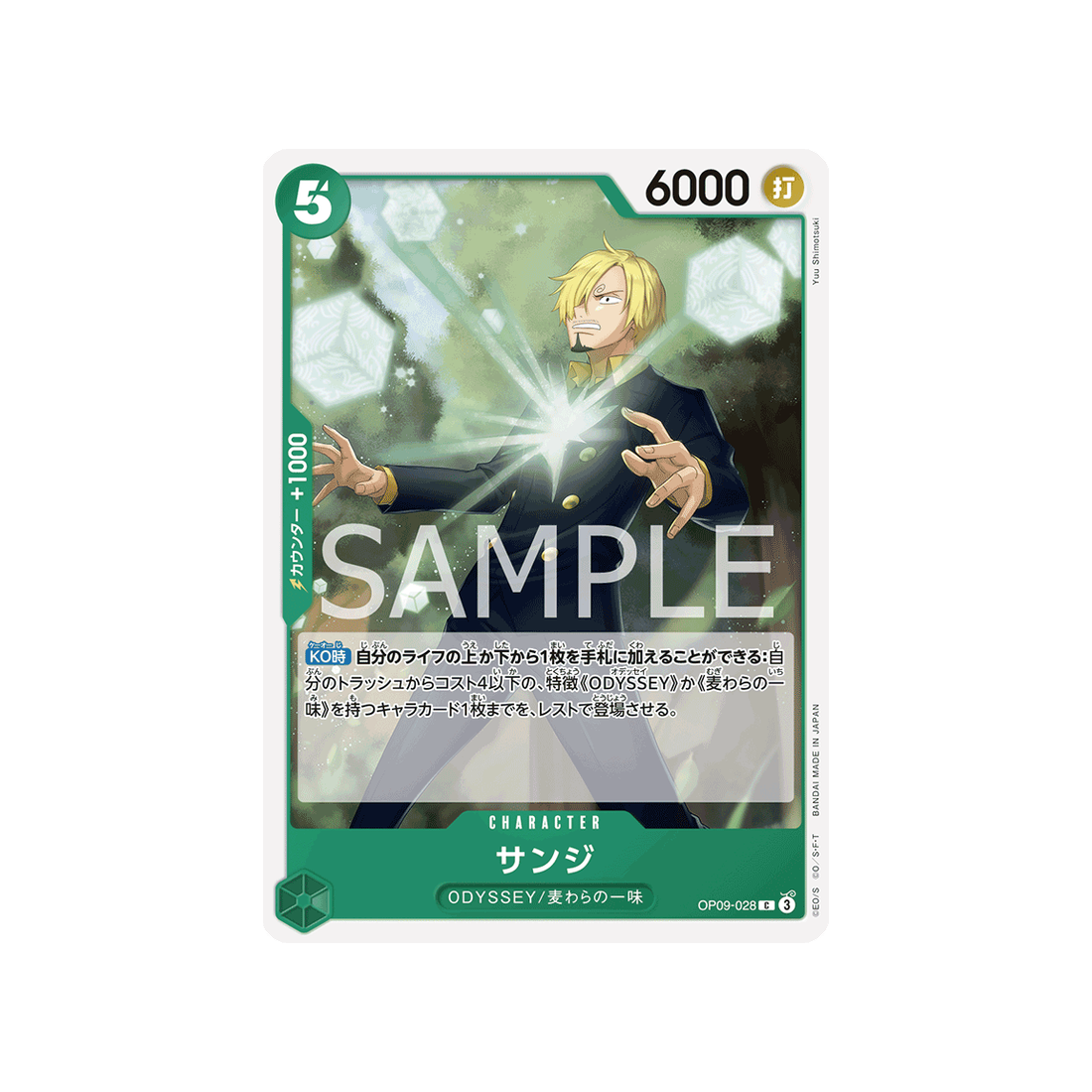 Si tu cherches une carte qui peut s'adapter à toutes les situations, ne cherchez pas plus loin que la carte OP09-028! Avec un coût de 5 'Don!', une puissance Frappe de 6000 points, ainsi qu'une valeur de contre de 1000 et de couleur Vert, la carte Character Sanji est un choix fiable pour les joueurs de tous niveaux.