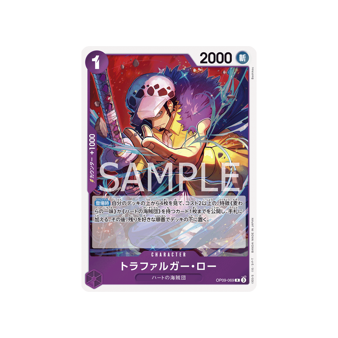 Si tu cherches une carte qui peut s'adapter à toutes les situations, ne cherchez pas plus loin que la carte OP09-069! Avec un coût de 1 'Don!', une puissance Coupe de 2000 points, ainsi qu'une valeur de contre de 1000 et de couleur Violet, la carte Character Trafalgar Law est un choix fiable pour les joueurs de tous niveaux.