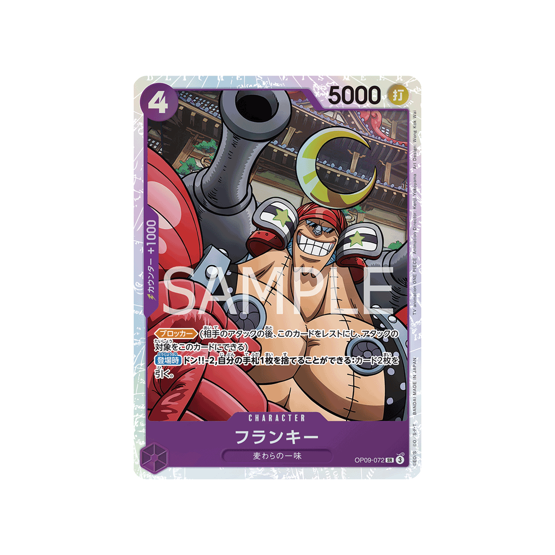 Si tu cherches une carte qui peut s'adapter à toutes les situations, ne cherchez pas plus loin que la carte OP09-072! Avec un coût de 4 'Don!', une puissance Frappe de 5000 points, ainsi qu'une valeur de contre de 1000 et de couleur Violet, la carte Character Franky est un choix fiable pour les joueurs de tous niveaux.