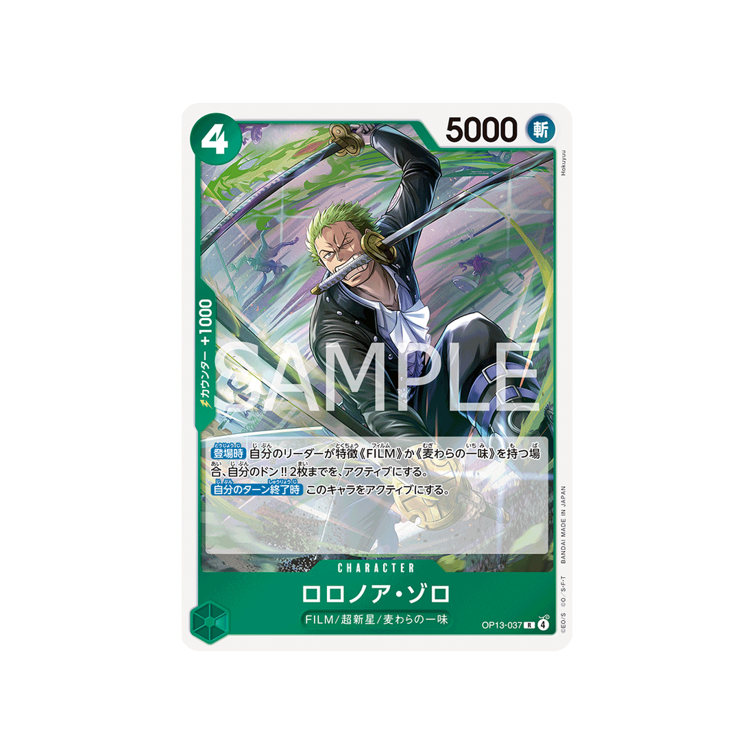 Le type Character est une carte indispensable dans tout deck qui se respecte ! Et Roronoa Zoro sera ton allié le plus précieux : de couleur Vert et avec l'attribut Coupe, il fera des ravages via un coût de 4 'Don!' et sa puissance de 5000 points, ainsi qu'une valeur de contre de 1000!