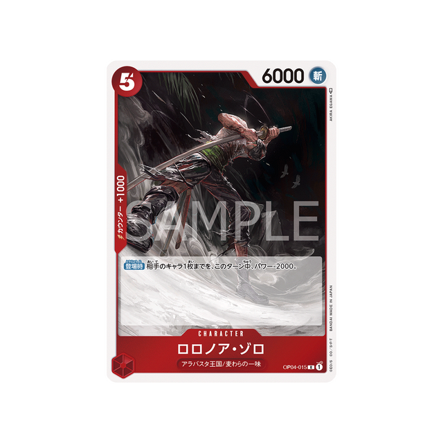 Le Character est une carte indispensable dans tout deck qui se respecte ! Et Roronoa Zoro sera ton allié le plus précieux : de couleur Rouge et avec l'attribut Coupe, il fera des ravages via un coût de 5 'Don!' et sa puissance de 6000 points, ainsi qu'une valeur de contre de 1000!