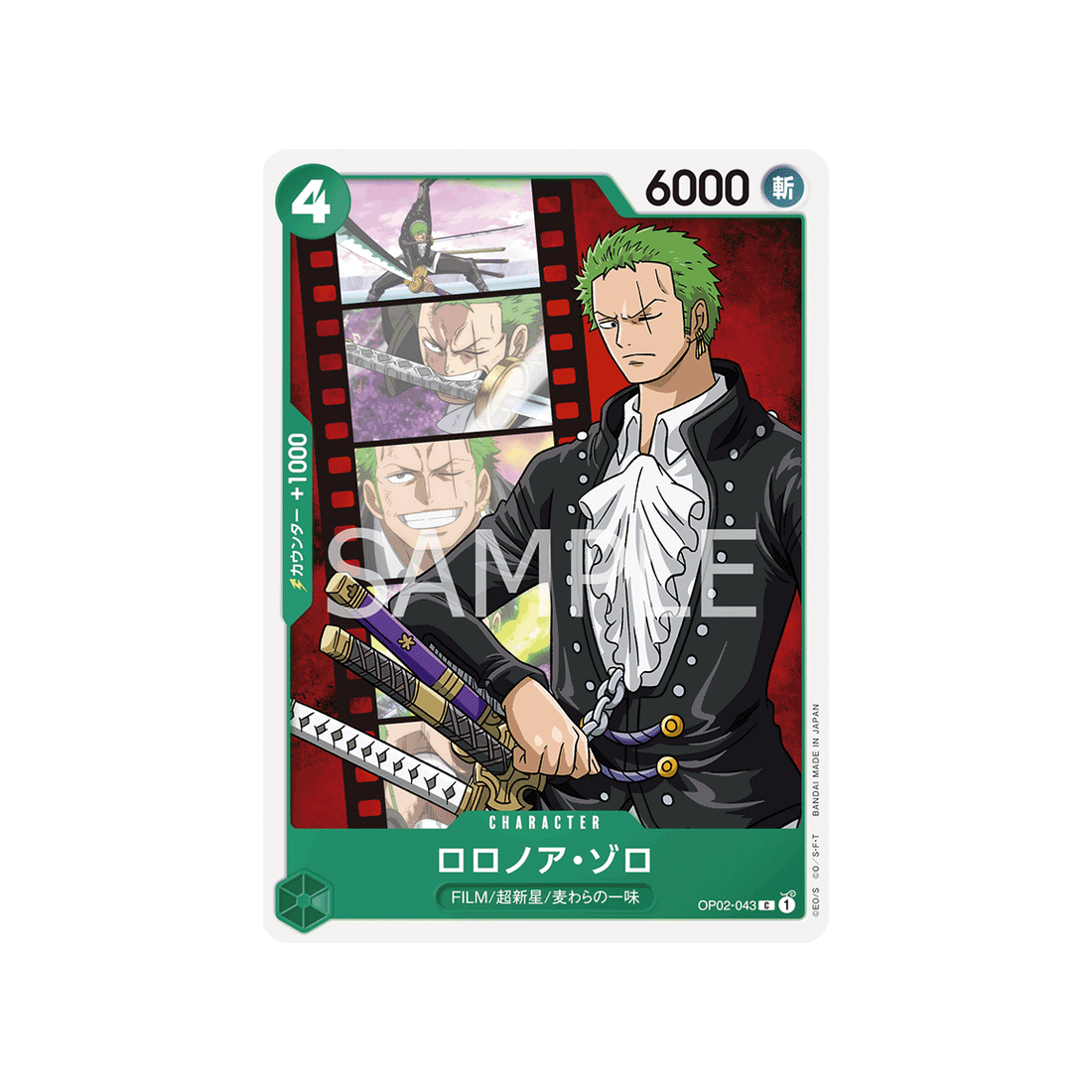 Si tu cherches une carte qui peut s'adapter à toutes les situations, ne cherchez pas plus loin que la carte OP02-043! Avec un coût de 4 'Don!', une puissance Coupe de 6000 points, ainsi qu'une valeur de contre de 1000 et de couleur Vert, la carte Character Roronoa Zoro est un choix fiable pour les joueurs de tous niveaux.