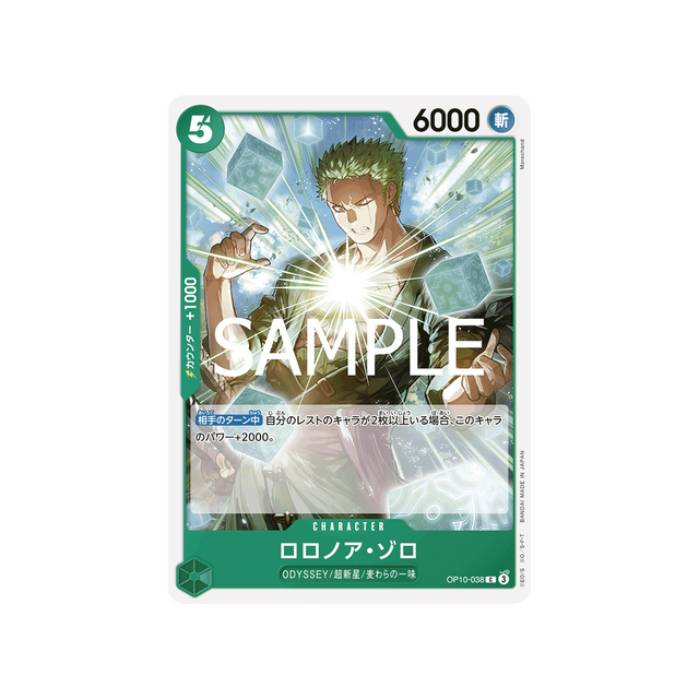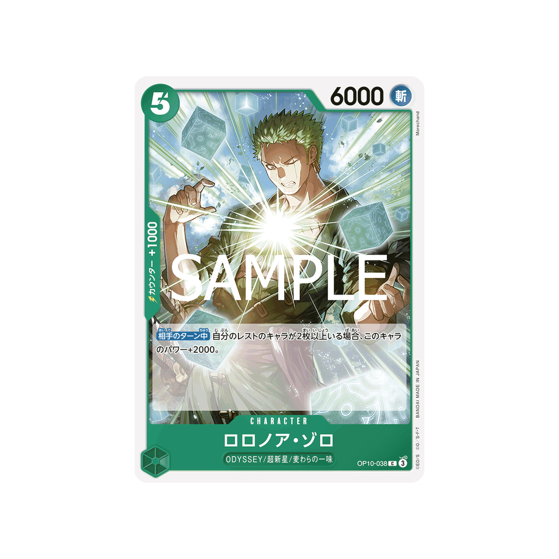 Si tu cherches une carte qui peut s'adapter à toutes les situations, ne cherches pas plus loin que la carte OP10-038! Avec un coût de 5 'Don!', une puissance Coupe de 6000 points, ainsi qu'une valeur de contre de 1000 et de couleur Vert, la carte Character Roronoa Zoro est un choix fiable pour les joueurs de tous niveaux.