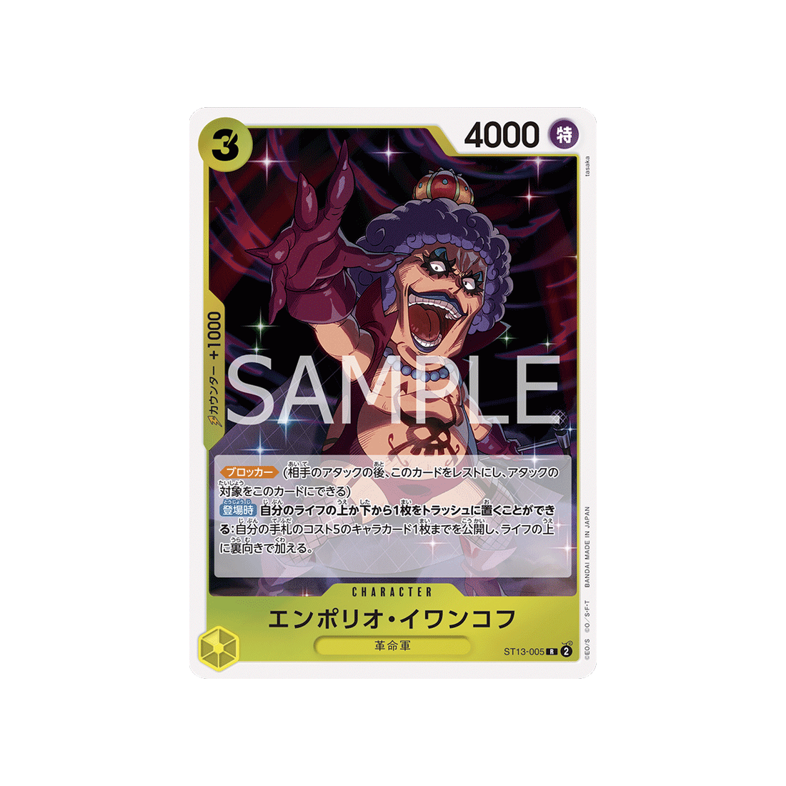Avec un coût de 3 'Don!', une puissance de 4000 points, ainsi qu'une valeur de contre de 1000 et une attaque de type Spécial, la carte Character Emporio.Ivankov est un must-have pour tout fan de One Piece qui se respecte.